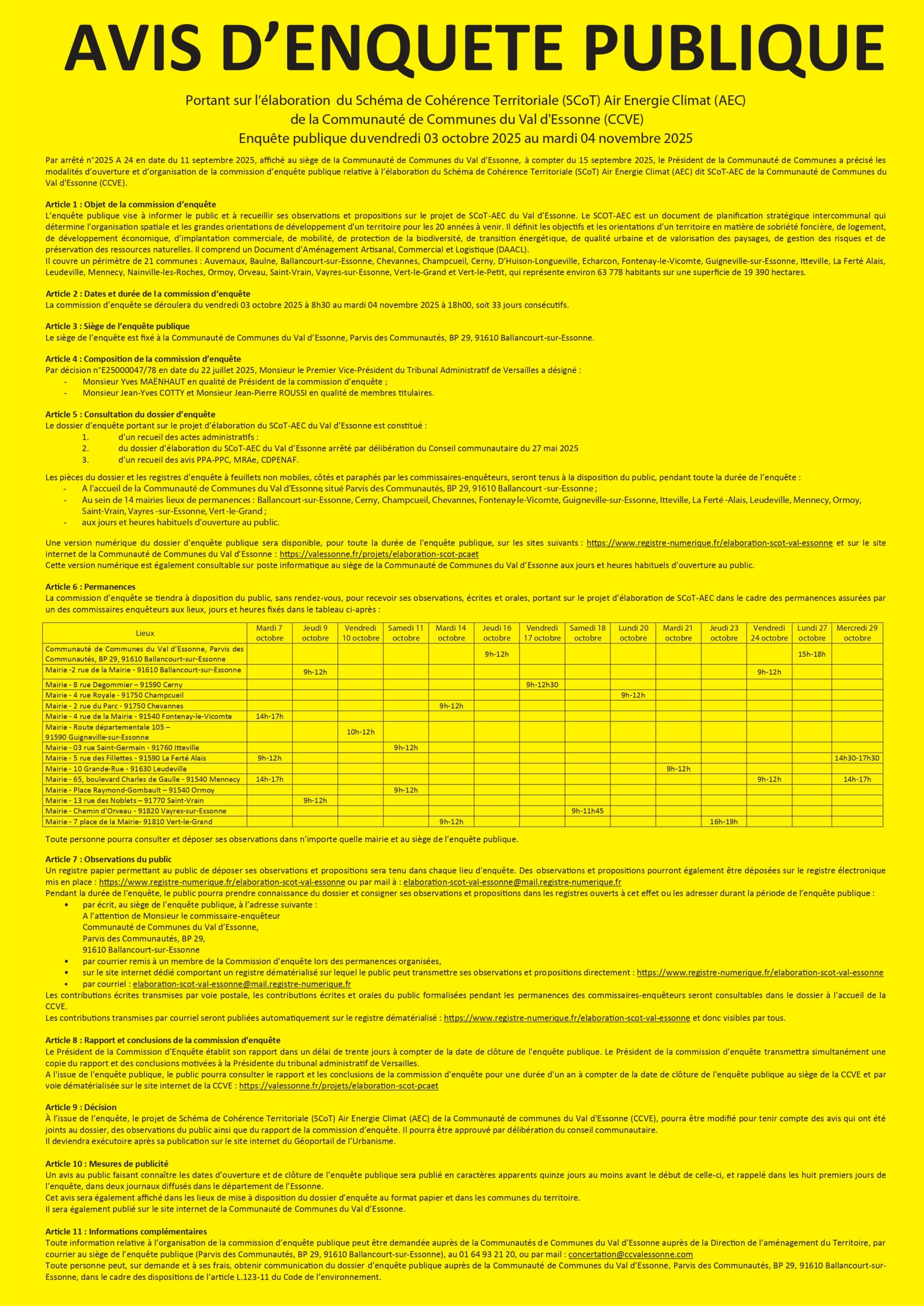 ENQUÊTE PUBLIQUE SUR LE Scot-AEC DU VAL D’ESSONNE DU VENDREDI 03 OCTOBRE AU MARDI 04 NOVEMBRE INCLUS